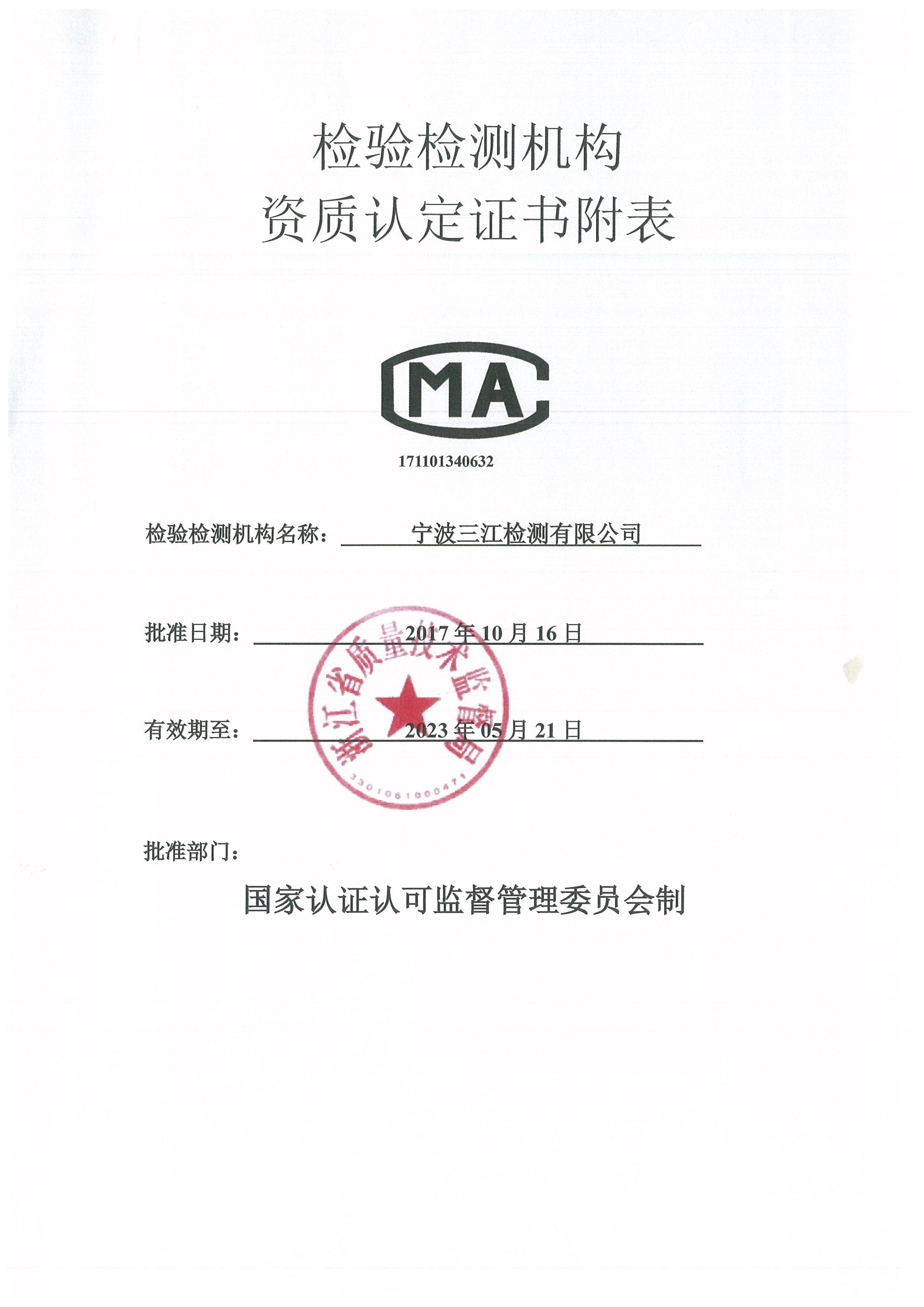 评审组通过查资料、现场检测、询问和考试等方式,对公司的人员、环境、标准、设备、检验检测能力,以及管理体系的符合性等进行了全面核查。评审组的现场核查结论为:公司的管理体系符合评审准则的要求,并与开展的检测工作相适应;能力验证、质量监督、纠正措施、预防措施、结果的质量控制、内审、管理评审等质量活动符合评审准则及相关规定要求;环境设施和仪器设备的配置符合标准要求;检测和技术管理人员的能力满足所开展检测项目的要求;现场考核表明公司具备了所申请的五个在类17个检测对象37个检测项目的技术能力,现场评审予以确认通过。扩项资质认定证书附表于2017年10月16日批准,有效期到2023年5月21日。